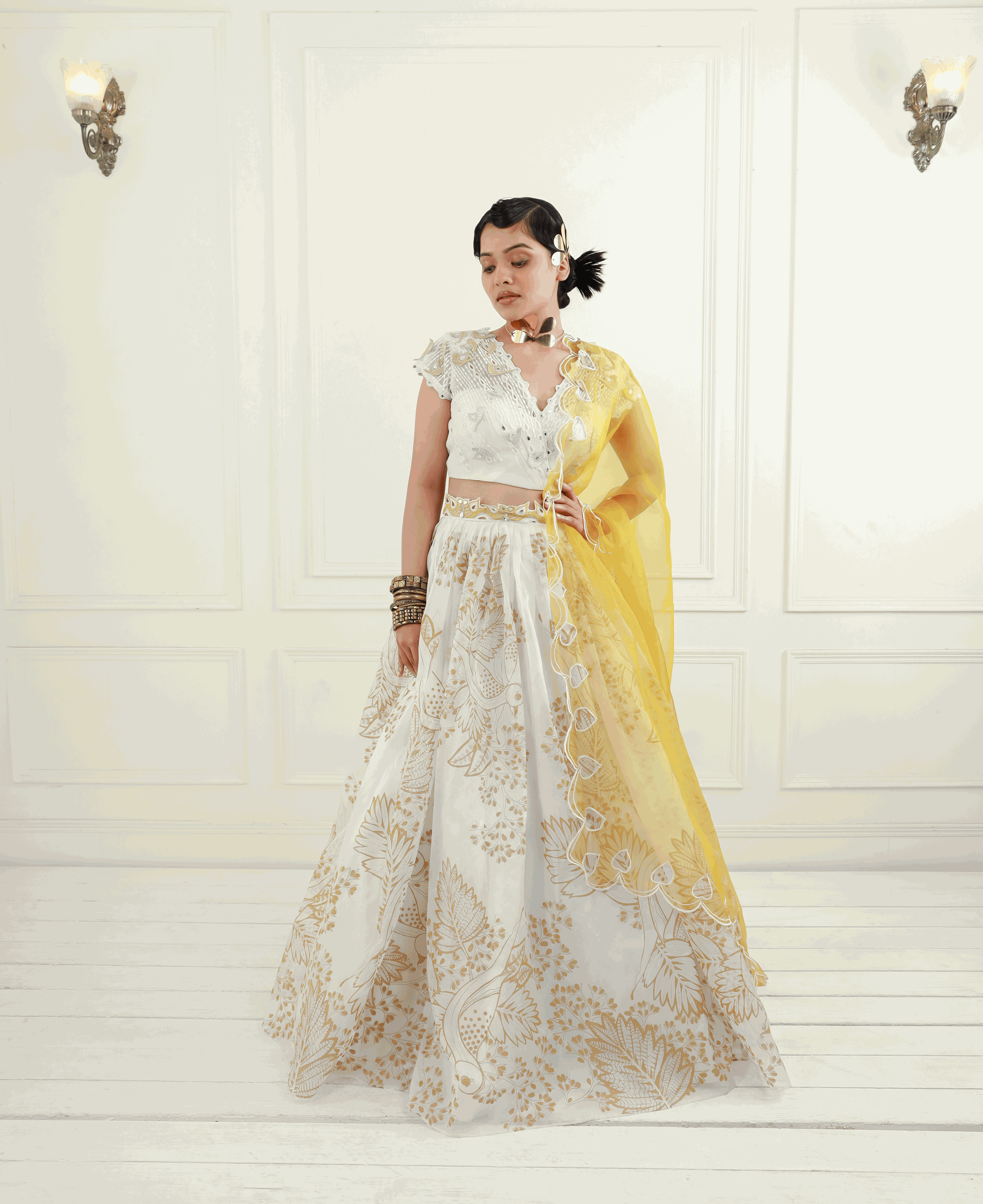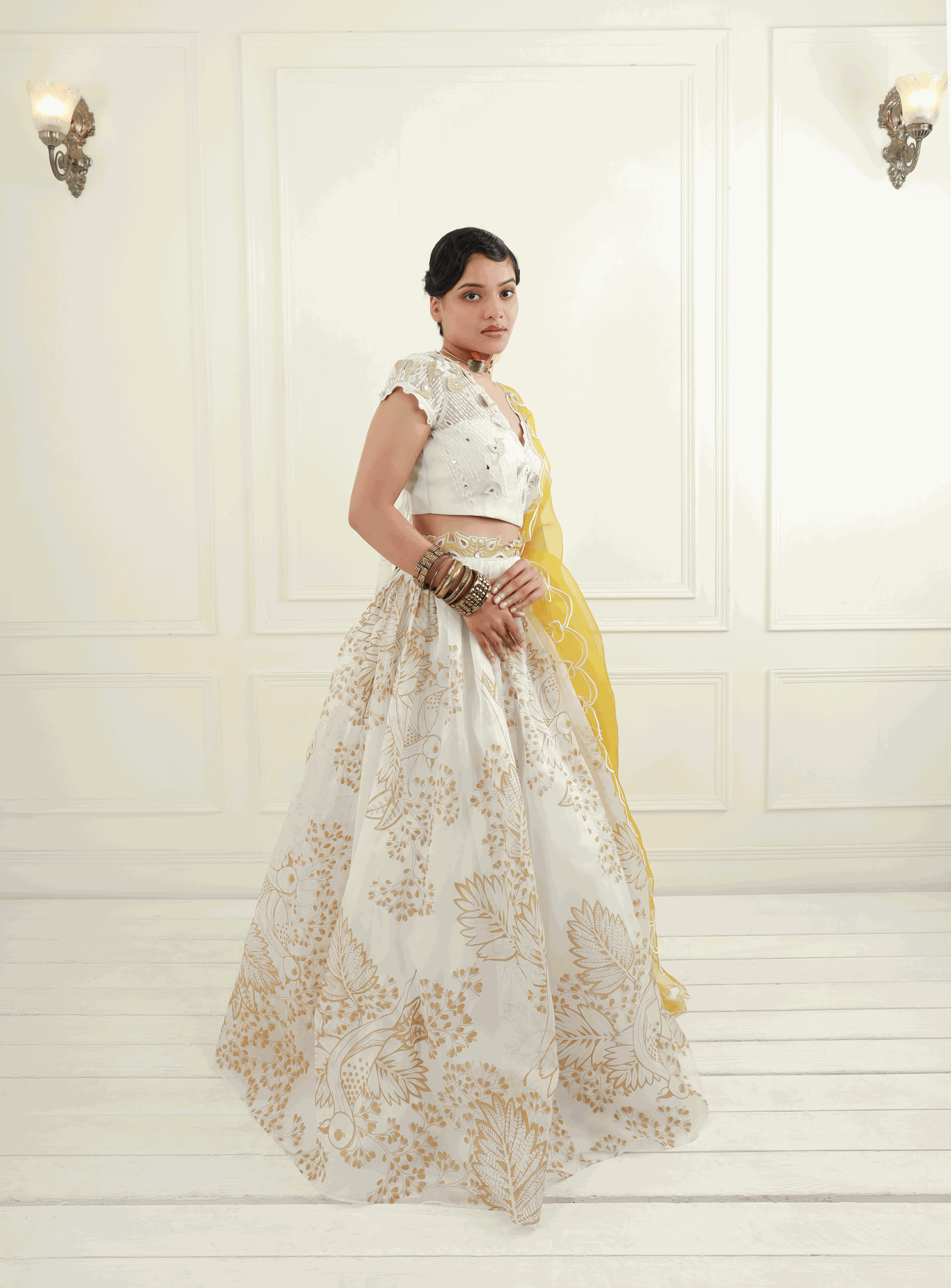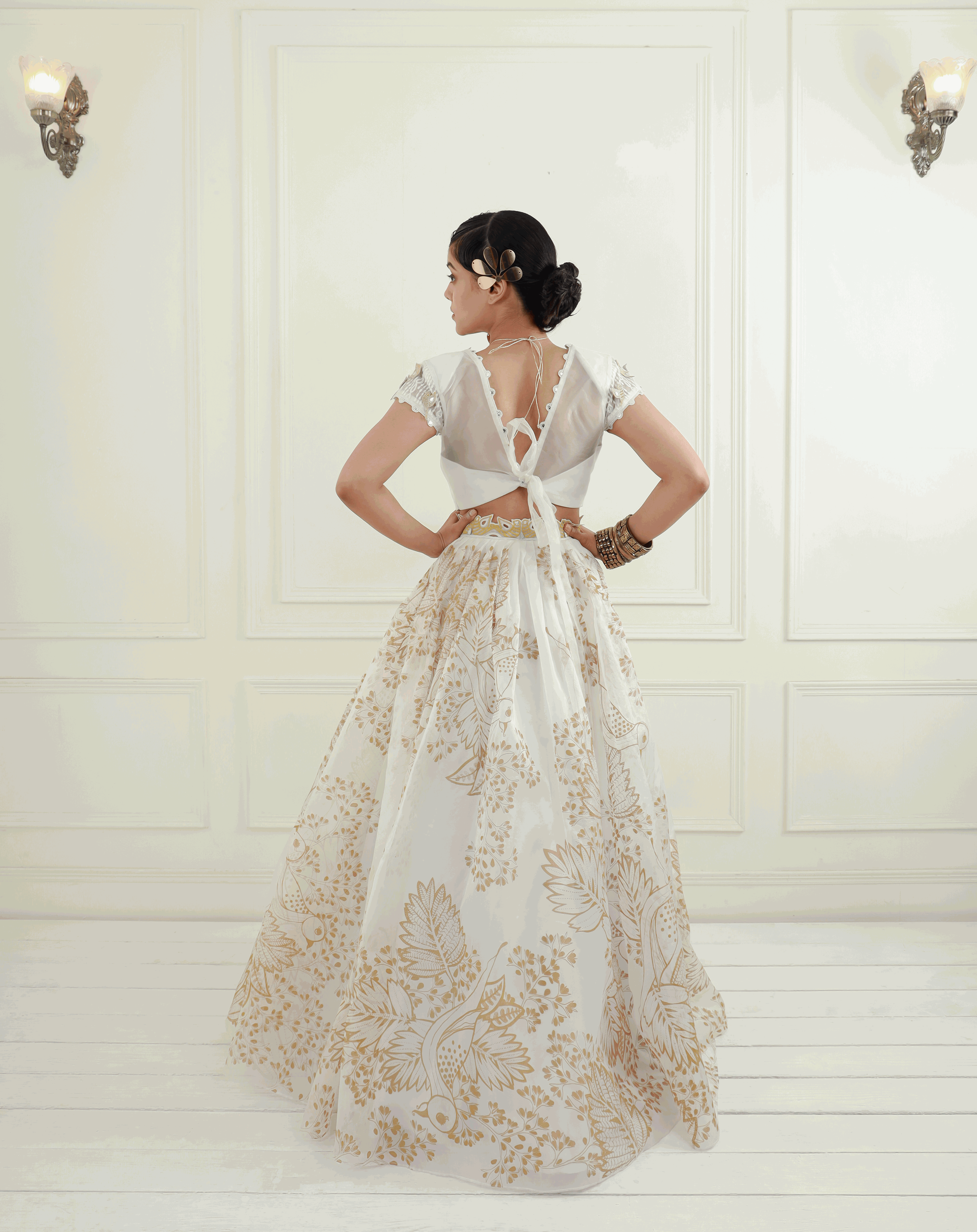 - Skirt: A pleated, off-white organza lehenga skirt featuring honey gold prints, complemented by an embroidered belt for a flattering silhouette. The CAN CAN underskirt adds volume and grace to your look.