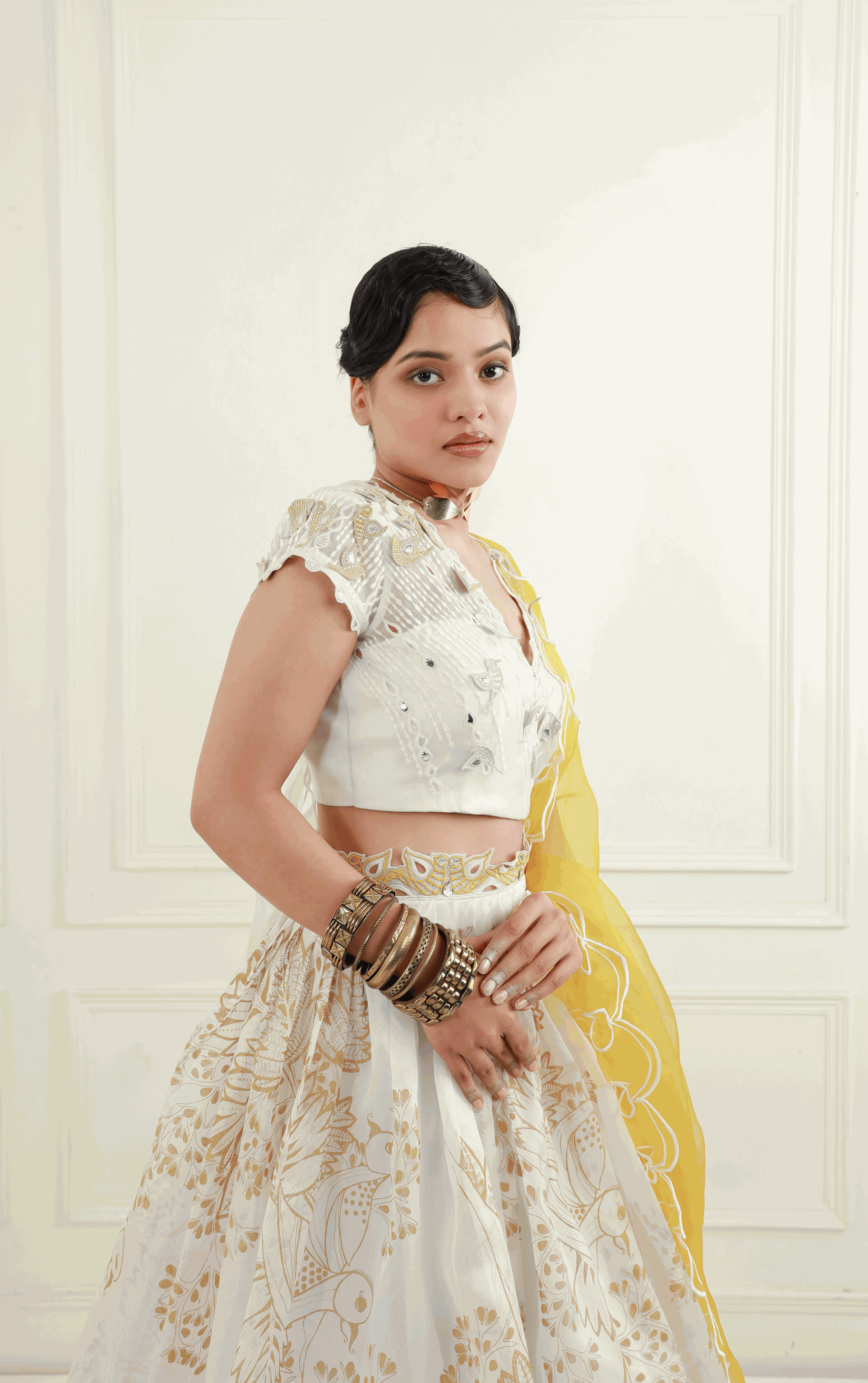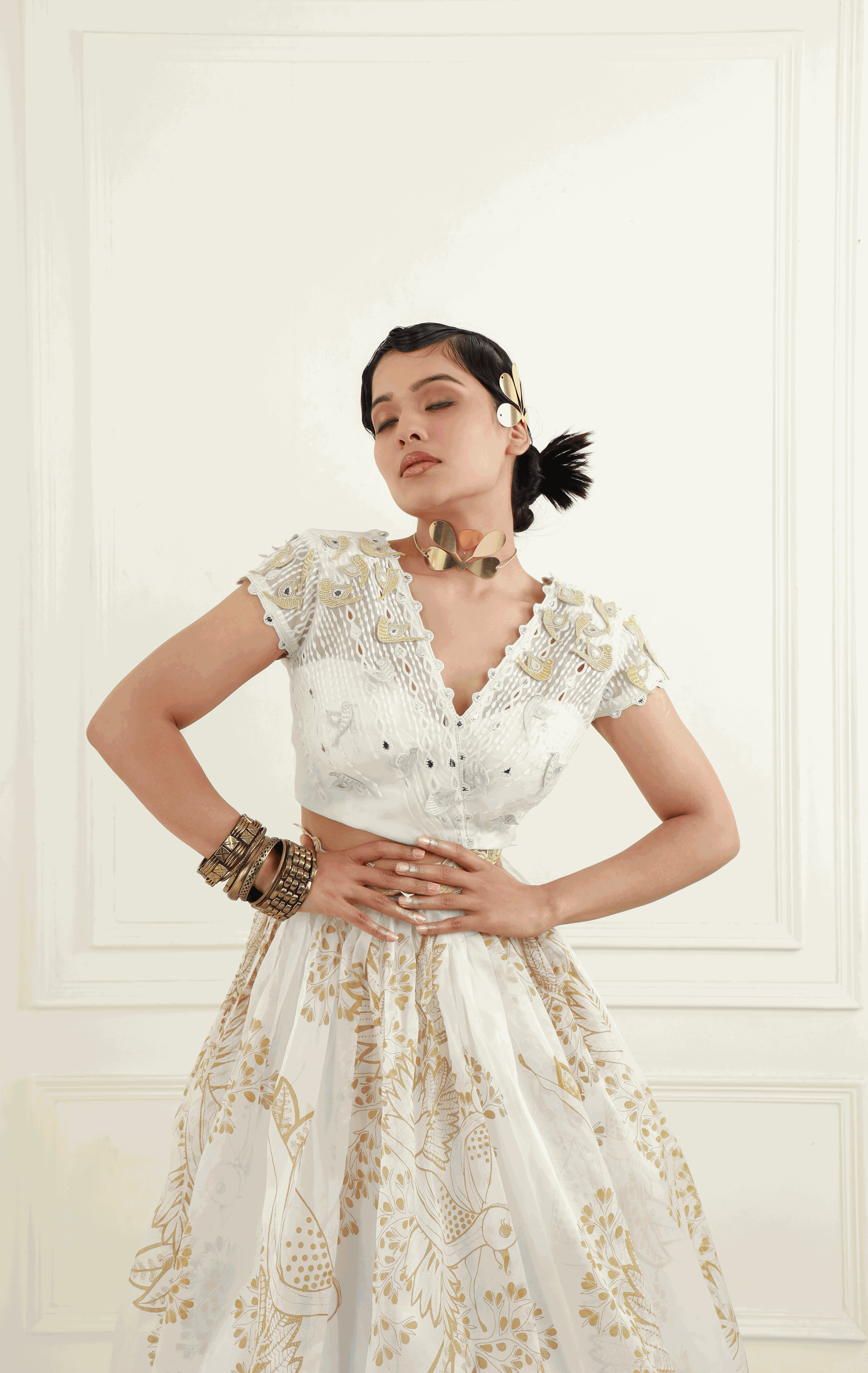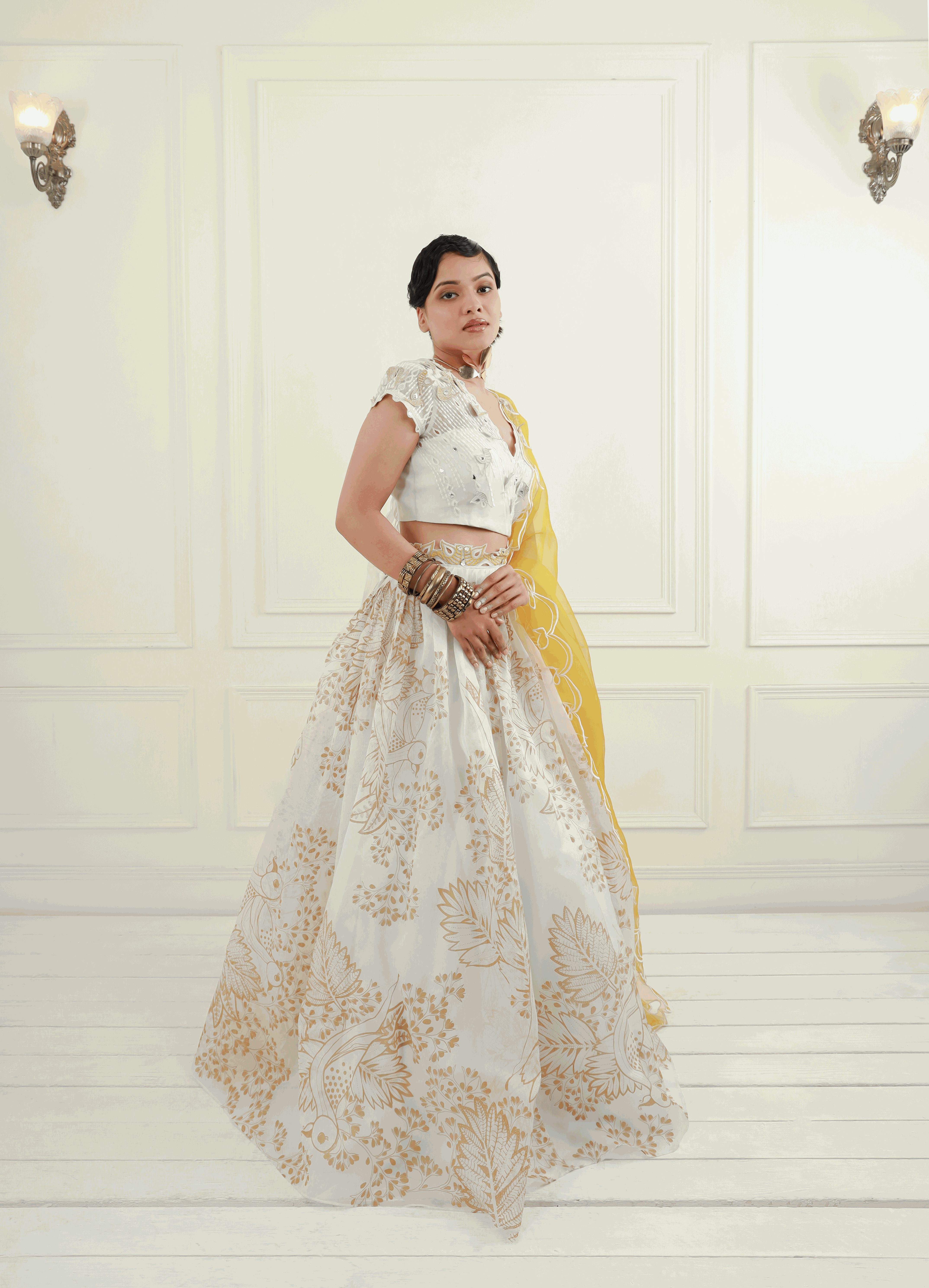 - Skirt: A pleated, off-white organza lehenga skirt featuring honey gold prints, complemented by an embroidered belt for a flattering silhouette. The CAN CAN underskirt adds volume and grace to your look.
