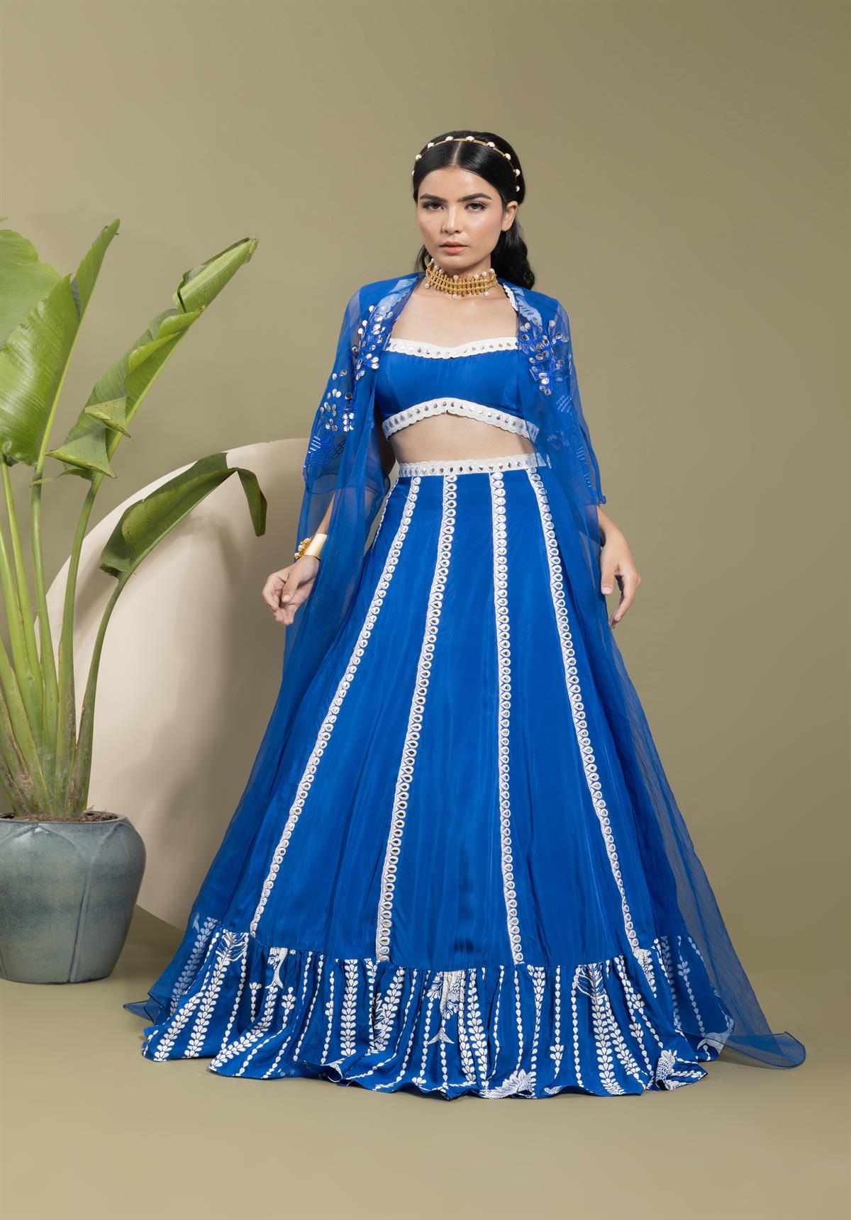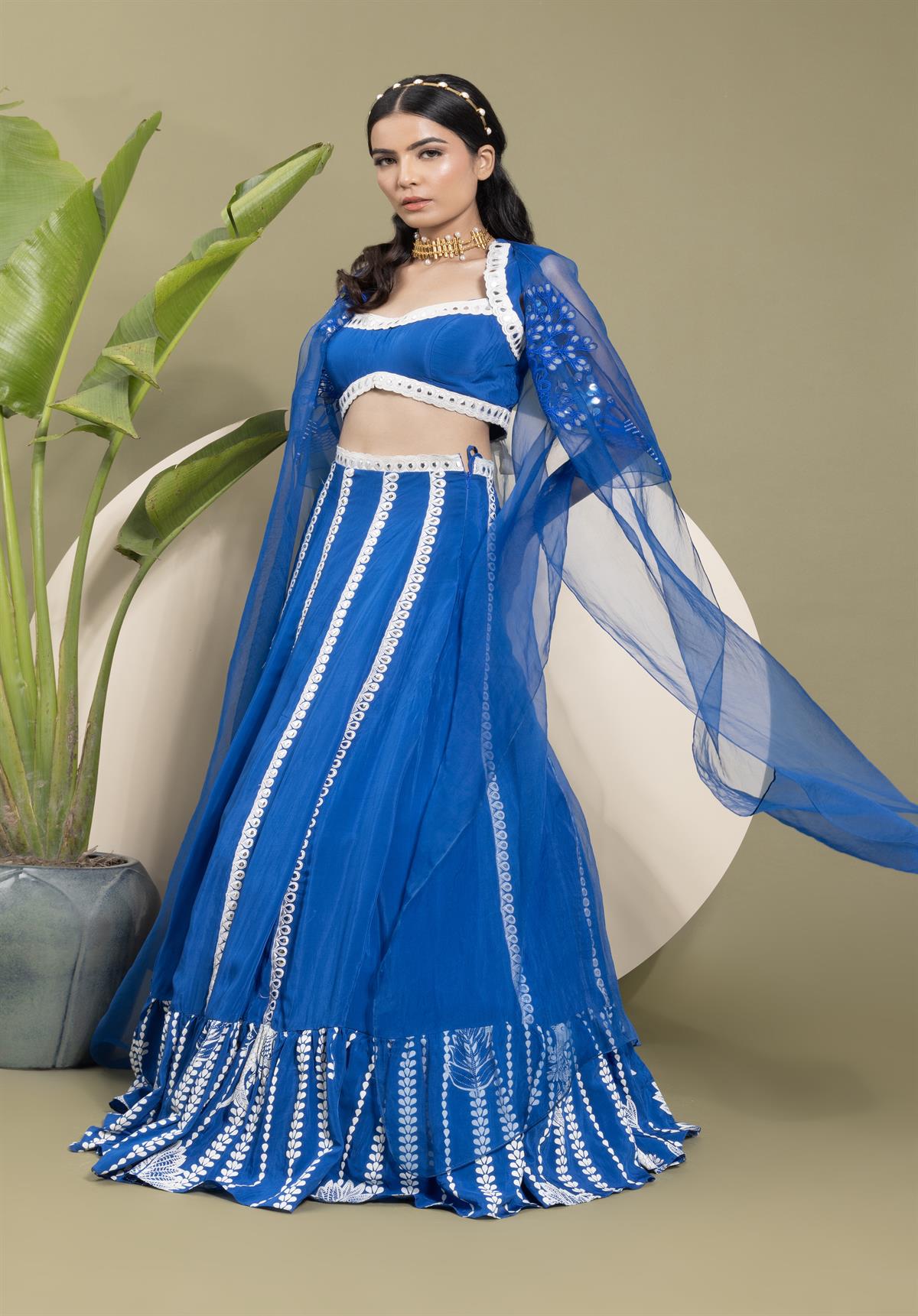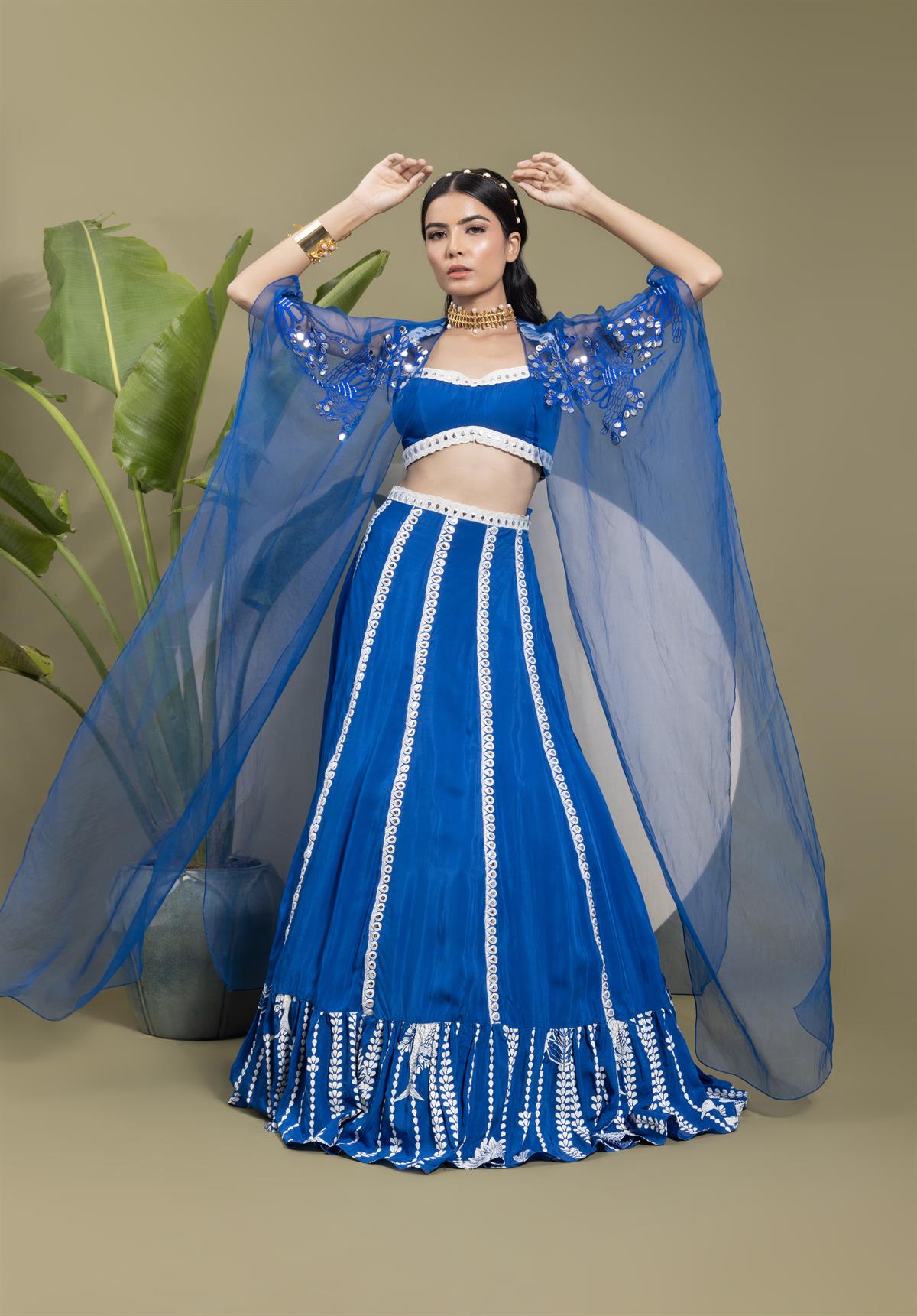 • Description: This elegant set features an electric blue crepe skirt with bold stripes, complemented by intricate Resham thread embroidery in a leaf pattern. A printed border adds a touch of traditional charm. The backless choli in matching electric blue pairs beautifully with the sheer organza embroidered cape, making a statement with its flowing silhouette.