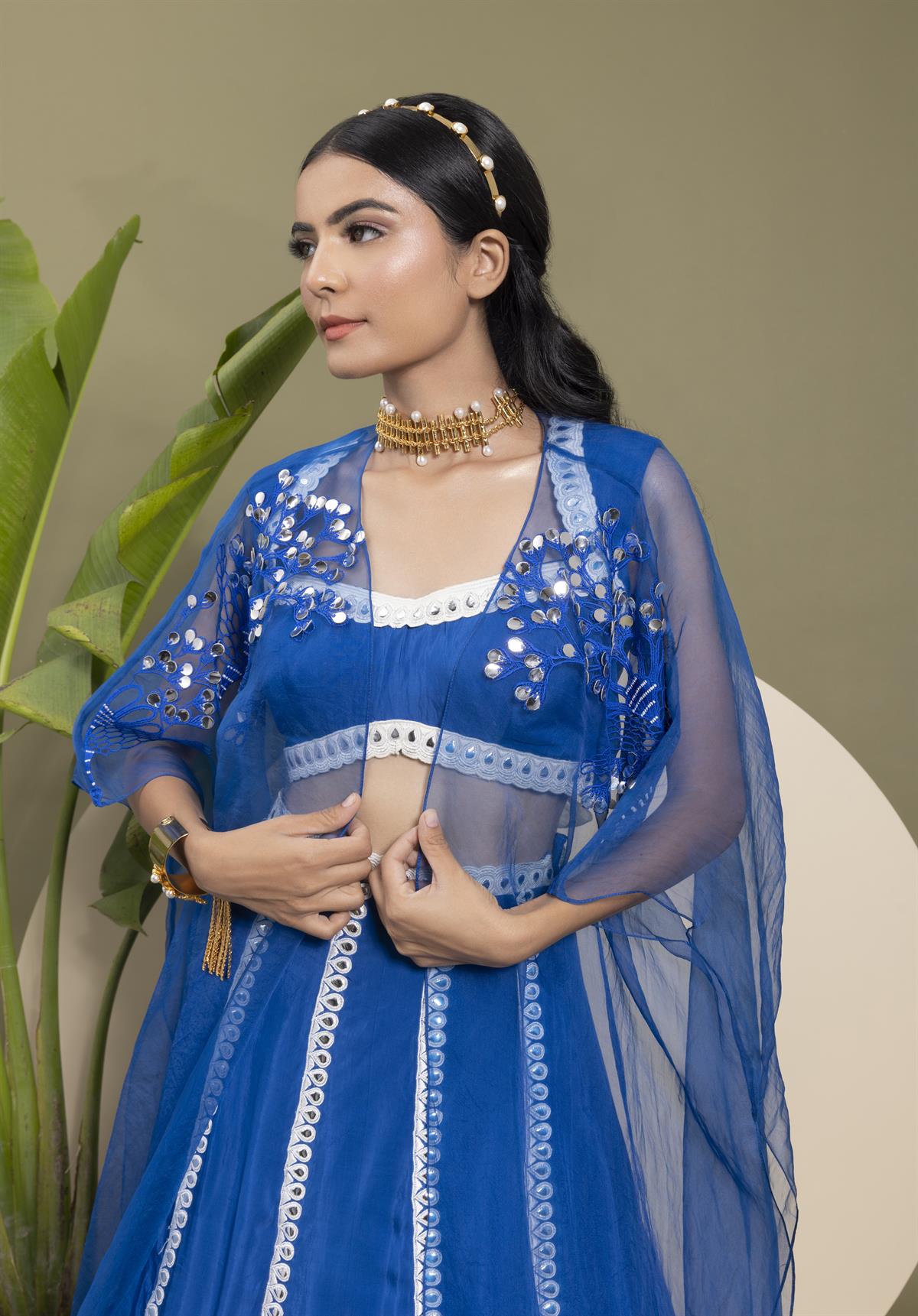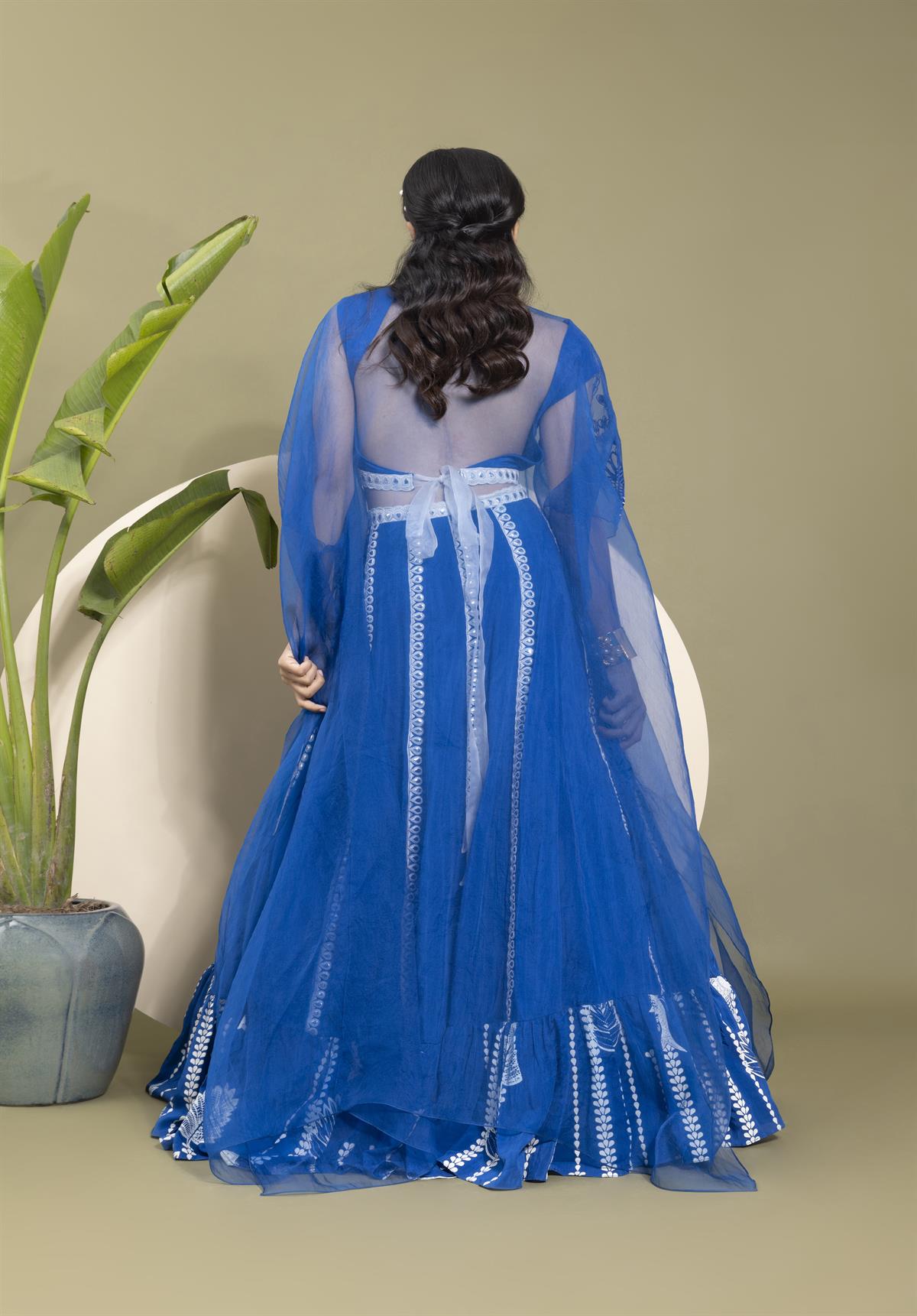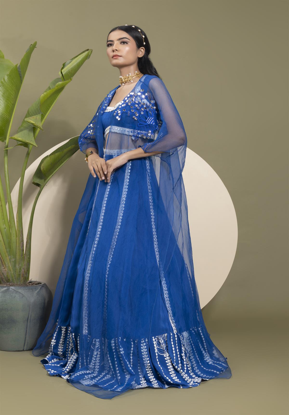 • Description: This elegant set features an electric blue crepe skirt with bold stripes, complemented by intricate Resham thread embroidery in a leaf pattern. A printed border adds a touch of traditional charm. The backless choli in matching electric blue pairs beautifully with the sheer organza embroidered cape, making a statement with its flowing silhouette.